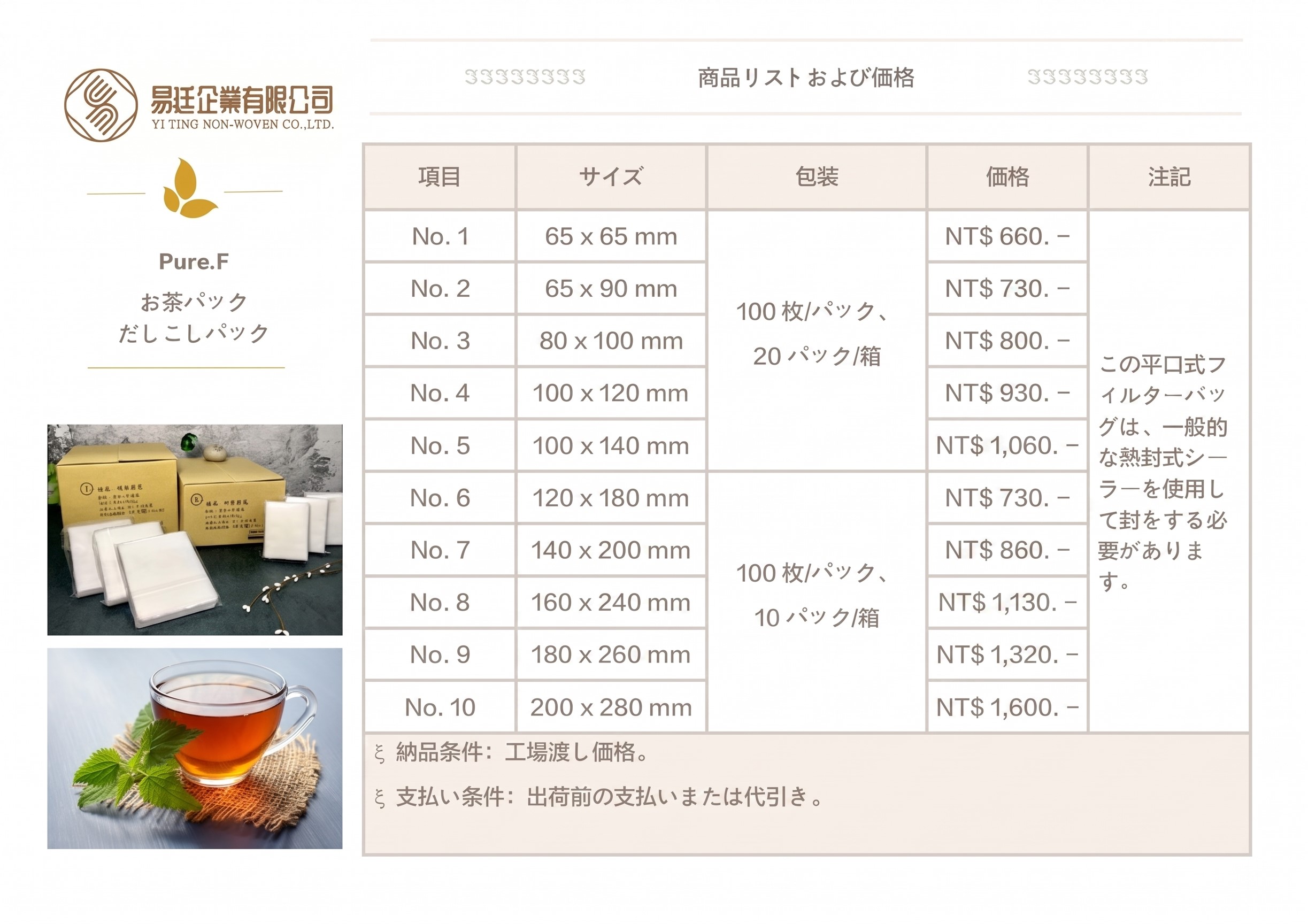 Yi-Tingの熱圧着ティーバッグは、SGSによる厳しい検査をクリアしており、安全性とパフォーマンスが証明されています。使用している不織布素材は、重金属・可塑剤・漂白剤・蛍光剤などの有害物質を含まず、台湾のCNS食品安全基準にも適合しています。